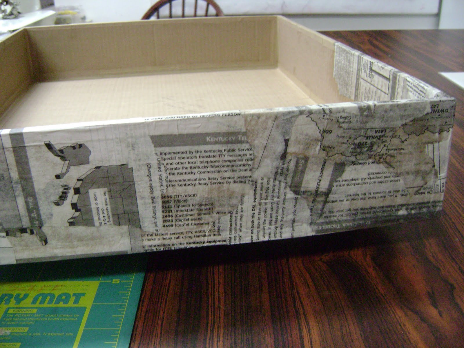 I'm going to decoupage the whole thing with the paper and wall paper paste. Here I've started working on the drawer. I coat everything on the whole furniture piece, inside and out with the paper and paste. Notice how the flutes don't show on the top of the drawer? That's because I've covered it with kraft tape.